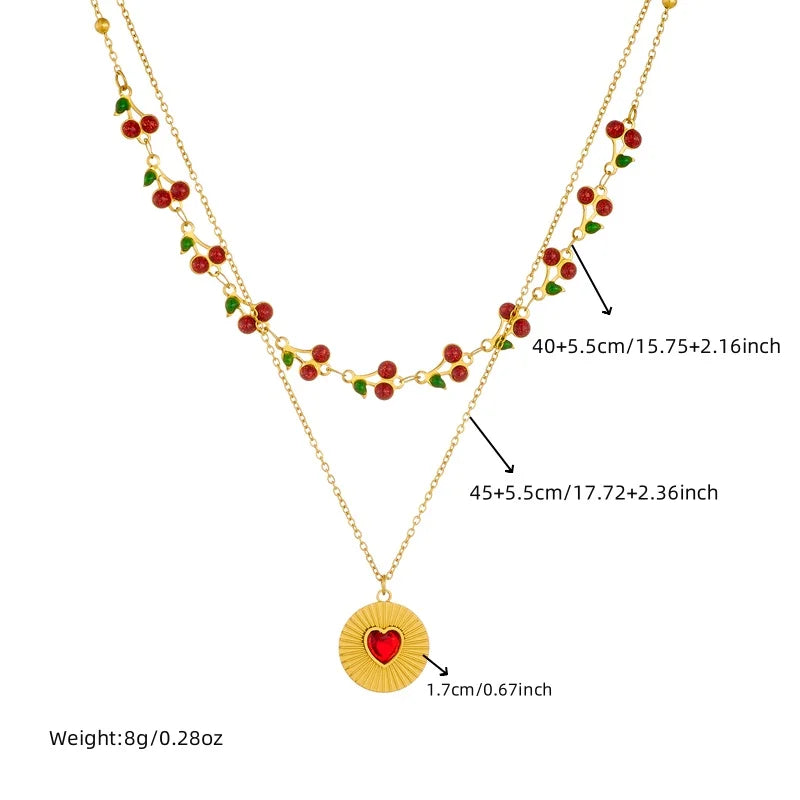 DIEYURO 316L Stainless Steel cherry Circular Inlaid Red Heart Zircon Double-layer Necklace WomensTrend Neck Chain Jewelry Gift