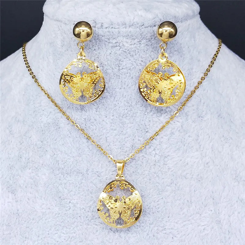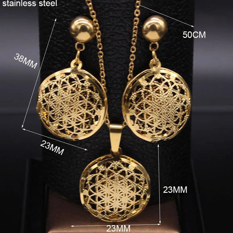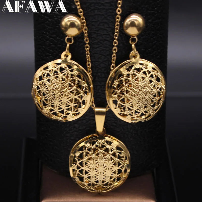 Flower of Life Stainless Steel Jewelry Set Women Hollow Gold Color Necklace Earrings Set Jewelry