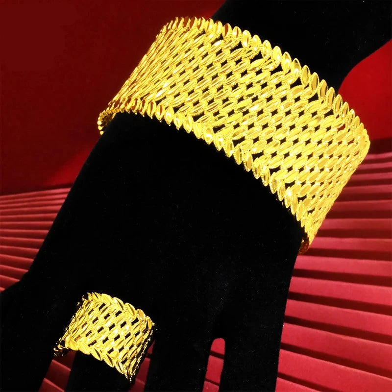 XUHUANG Dubai Exquisite Plated Gold Hollow Bangle With Ring For Women Arab Luxury Charm Copper Bangles Bracelets
